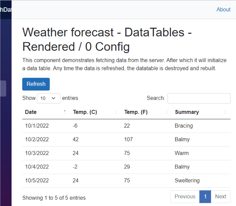 Experiment with the refresh button and search functionality and sort functionality. Set some break points in your Visual Studio to test out the OnAfterRenderAsync, RefreshForecastsAsync and Dispose methods in DataTables2.razor.