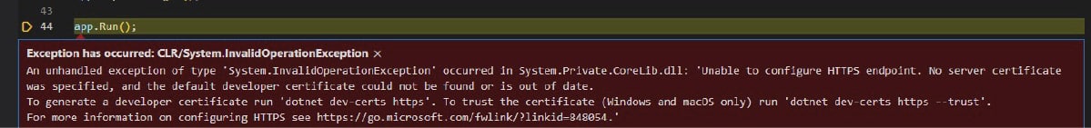 Running dotnet run again should no longer be an issue. However, if you attempt to register an account in your web application, it will say that the database has not been initialized yet. Close your browser, and stop the run process in the terminal with a CTRL+C Try and run the following command: