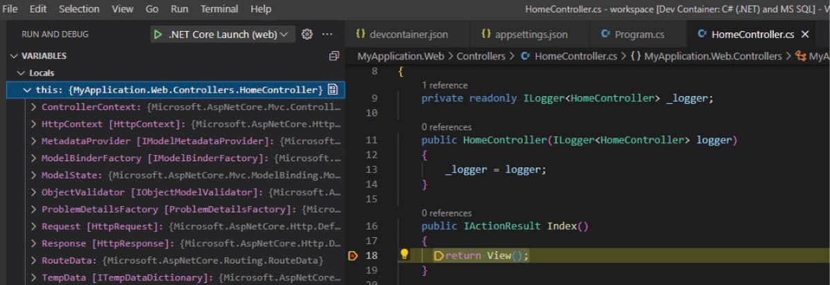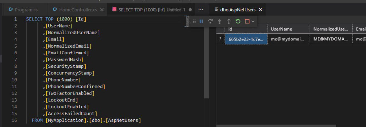 Open the appsettings.json file within the MyApplication.Web folder within Visual Studio Code to begin editing it. You will notice that there is a “DefaultConnection” attribute there. That connection string would work on windows. But it will not work for our dev container.